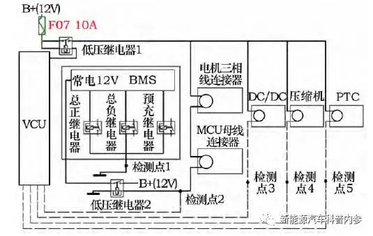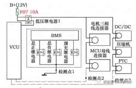 檢測點(diǎn)2表現(xiàn)電機(jī)和電機(jī)操控器的高壓互鎖檢測成果,檢測點(diǎn)3反應(yīng)DCDC、空調(diào)壓縮機(jī)和PTC的高壓互鎖回路無缺景象。假如檢測點(diǎn)2、 3的電壓是12V闡明連接正常,假如是0V,闡明有連接器斷開。VCU依據(jù)檢測點(diǎn)傳遞過來的信息,要求BMS操控主回路繼電器的通斷。