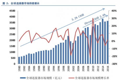 全球連接器市場近 40 年來持續(xù)增長,據(jù) Bishop&Associate 數(shù)據(jù)顯示,全球連接器市場從 1980 年的 594 億元增長到 2016 年的 3643 億元,復(fù)合增長率高達(dá) 5.2%,近十年來增速放緩,復(fù)合增長率為 2.6%。 雖然 2014 年之后連接器市場出現(xiàn)暫時性下滑,但隨之而來的經(jīng)濟(jì)復(fù)蘇與技術(shù)升級必將繼續(xù)帶動這一產(chǎn)業(yè)向前快速發(fā)展。